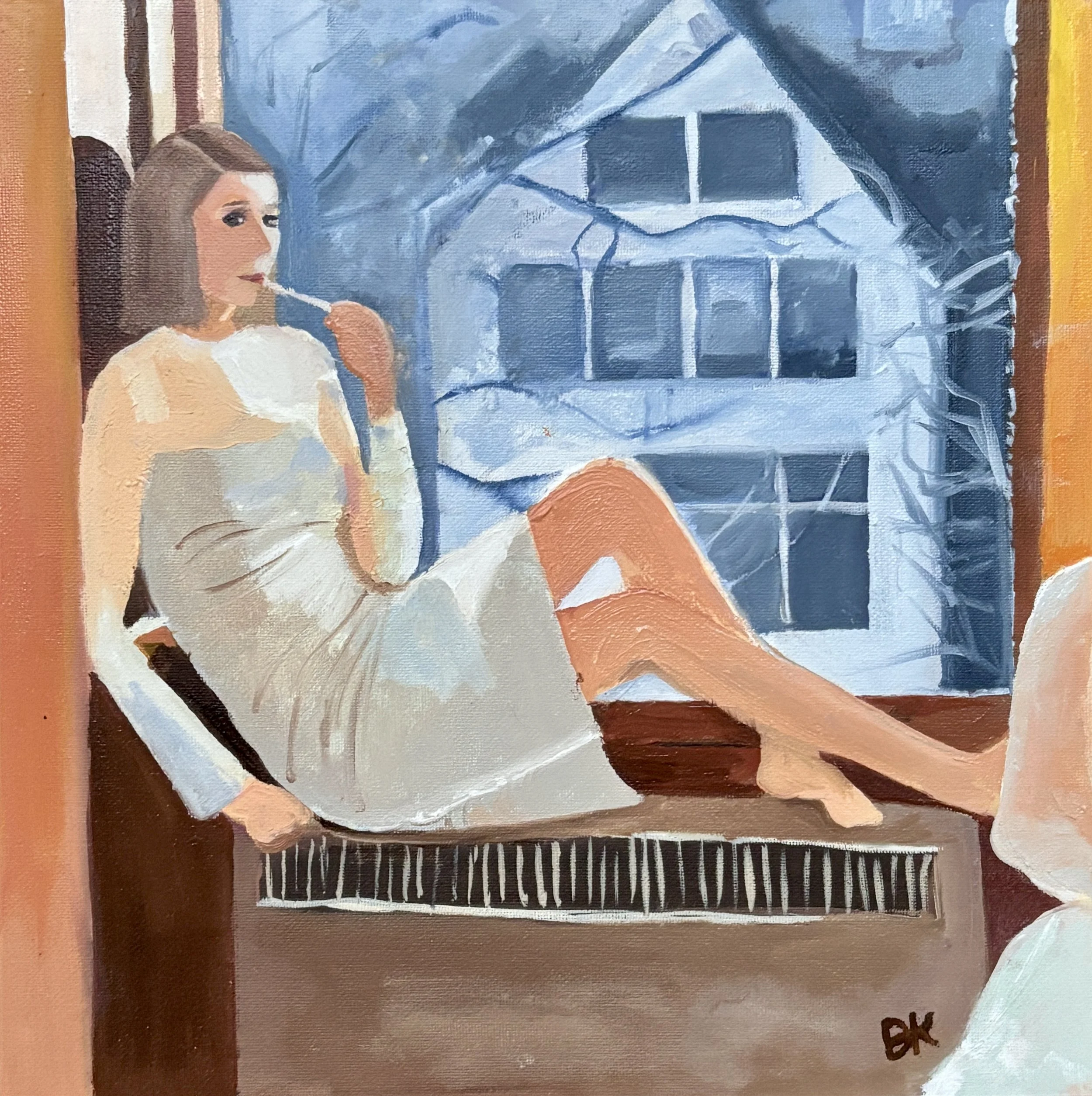 One: This painting was rescued from its ugly-duckling phase when the instructor helped me understand the lighting. Cool, blue light coming in from the wintery outside, of course, but this meant I had to warm up the interior side of her dress. The painting came to life when this contrast between warm and cool was established.